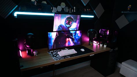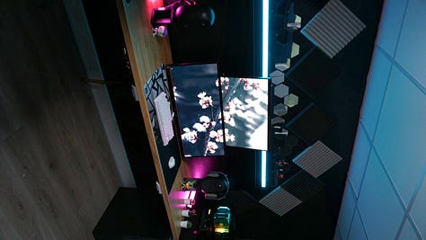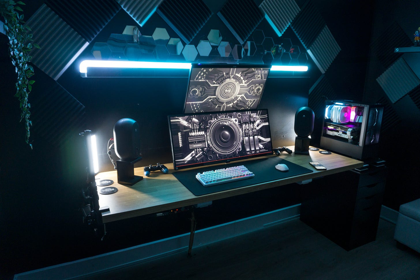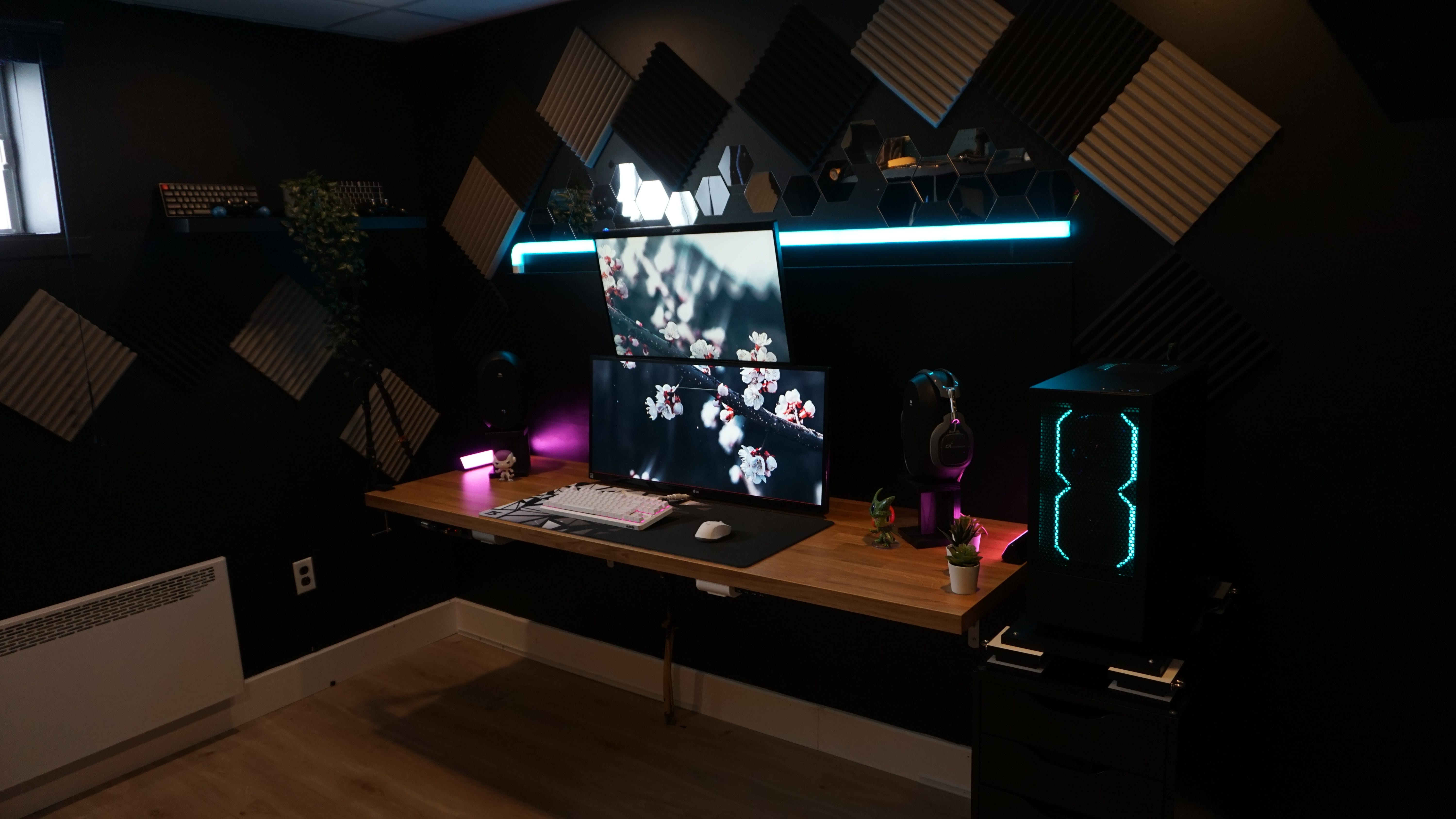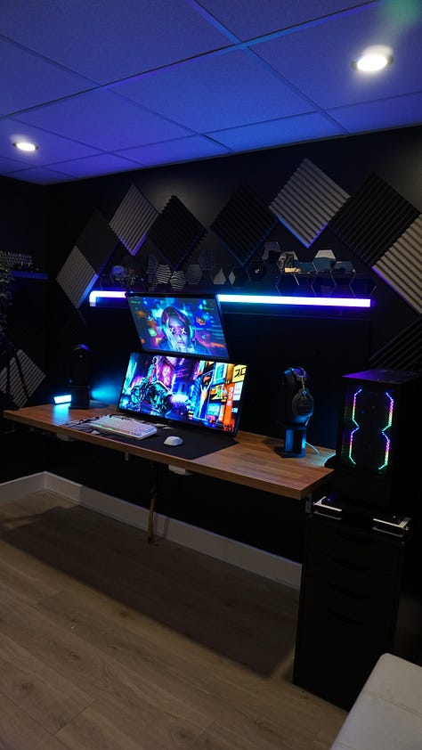 A large desk, dual monitor setup and the possibility to put in the right mood by adjusting the background lighting. This makes it the right place for Elias, 30 from Canada to dive into some gaming action. He is a construction worker and singer - check out more of him on Instagram.